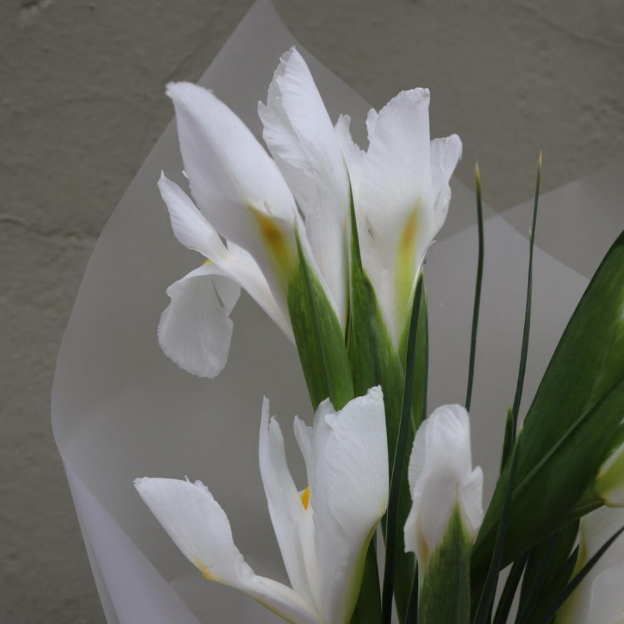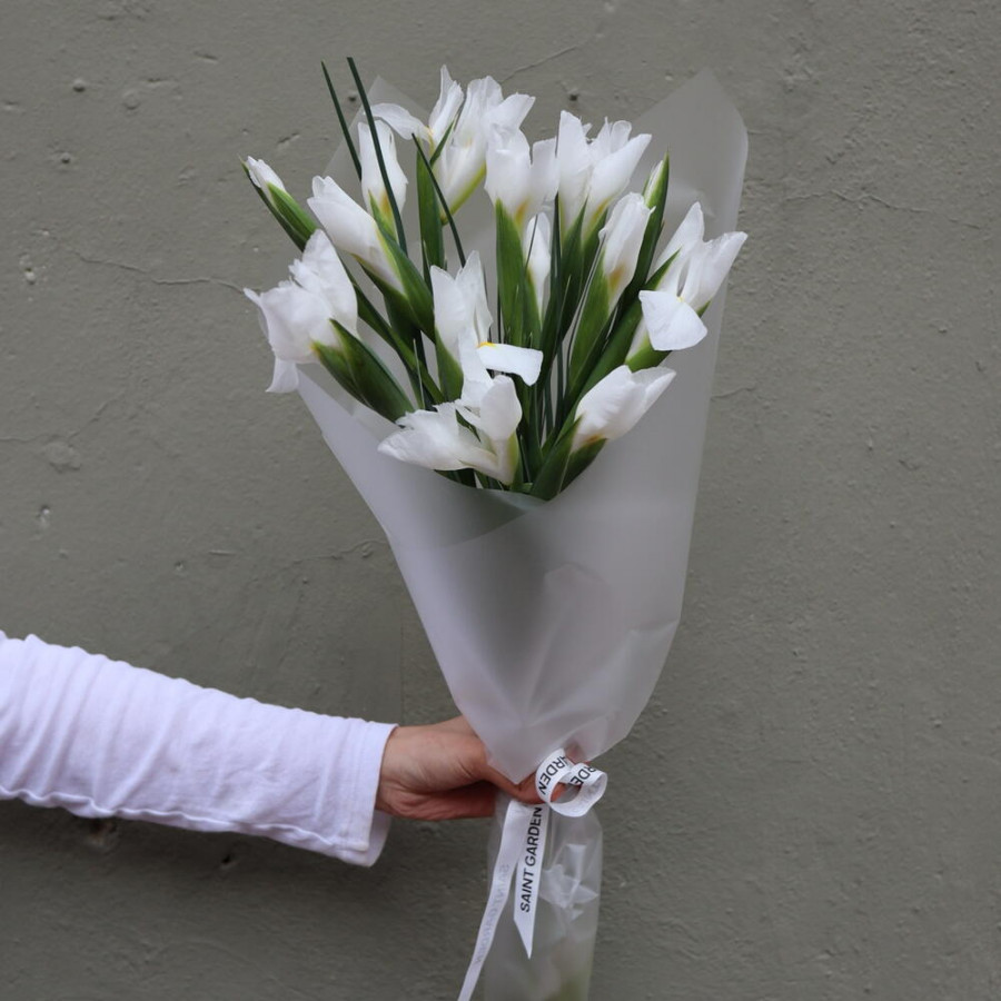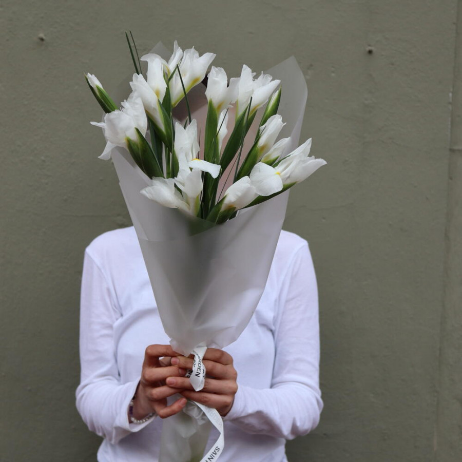 На фото букет 15 белых ирисов в стильной упаковке. В составе: ирис 15 шт, дизайнерская упаковка 1 шт, атласная лента 1 шт, . Все цветы свежие и ароматные, букет красиво оформлен и отлично подходит для подарка. Доступна доставка цветов или самовывоз.