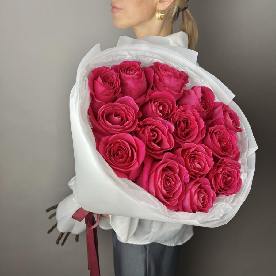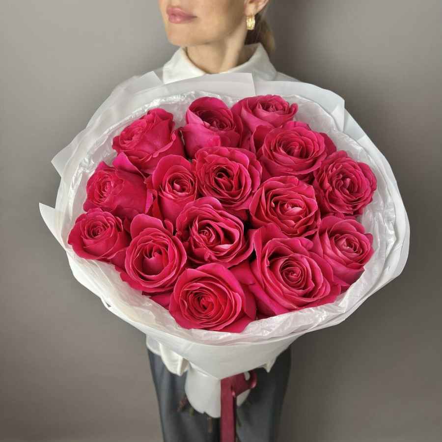 На фото букет из 15 малиновых роз. В составе: роза 15 шт, дизайнерская упаковка 1 шт, атласная лента 1 шт, . Все цветы свежие и ароматные, букет красиво оформлен и отлично подходит для подарка. Доступна доставка цветов или самовывоз.