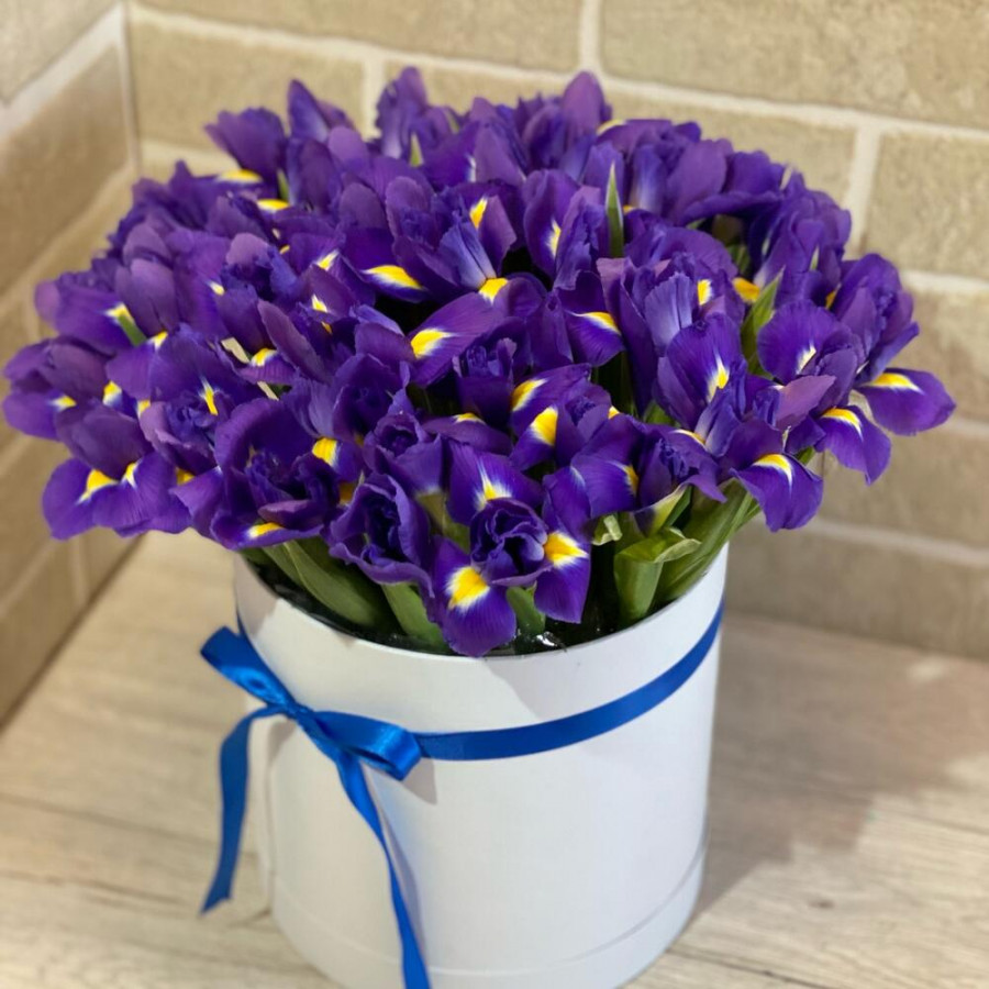 На фото 45 фиолетовых ирисов в шляпной коробке. В составе: ирис 45 шт, оазис флористический 1 шт, шляпная коробка (m) 1 шт, атласная лента 1 шт, . Все цветы свежие и ароматные, букет красиво оформлен и отлично подходит для подарка. Доступна доставка цветов или самовывоз.