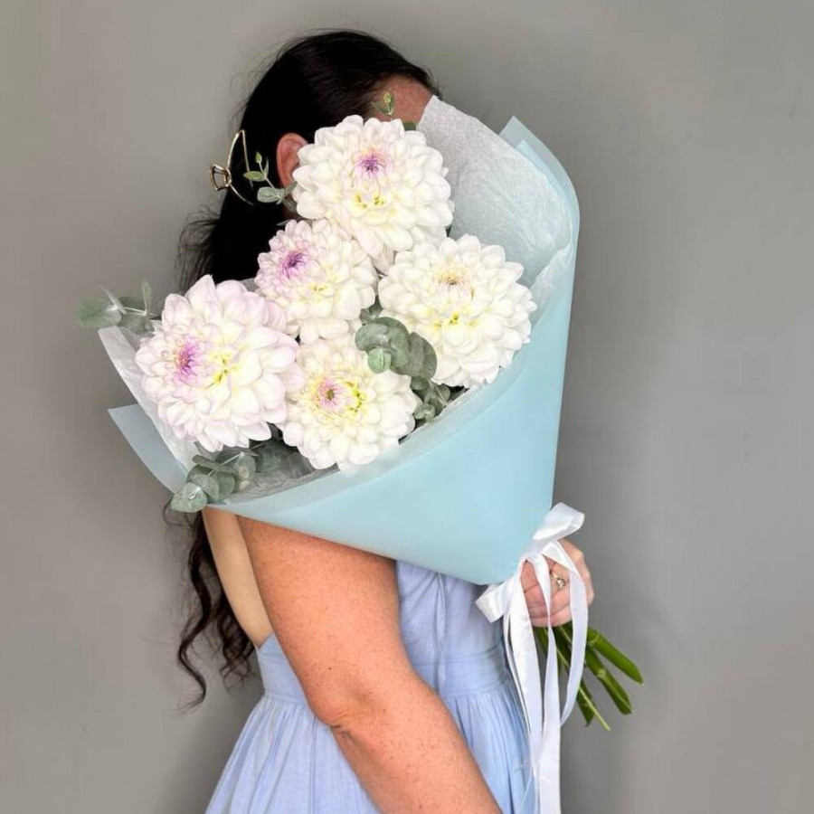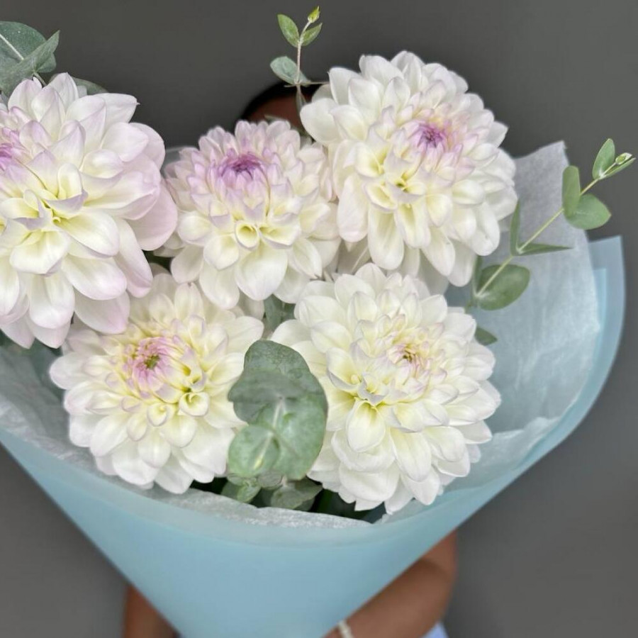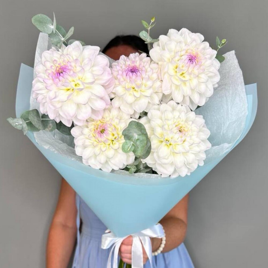 На фото букет из 5 белых георгин с эвкалиптом. В составе: георгина 5 шт, эвкалипт 2 шт, дизайнерская упаковка 1 шт, атласная лента 1 шт, . Все цветы свежие и ароматные, букет красиво оформлен и отлично подходит для подарка. Доступна доставка цветов или самовывоз.
