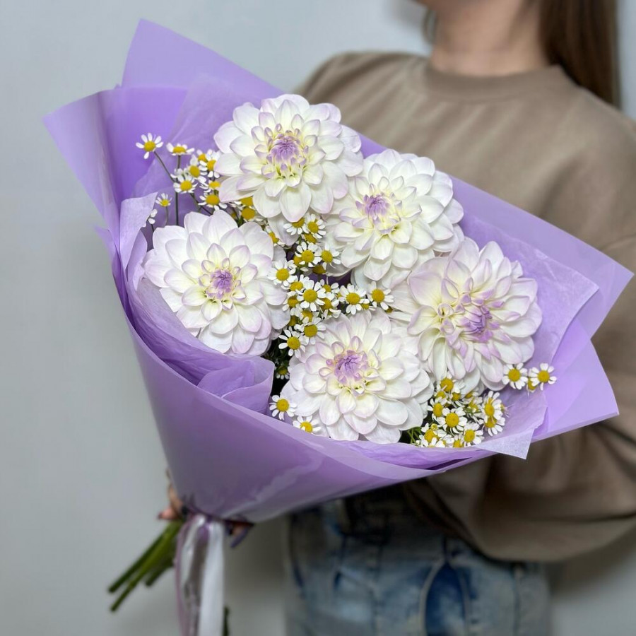 На фото букет из 5 белых георгин с ромашками. В составе: георгина 5 шт, танацетум 3 шт, дизайнерская упаковка 1 шт, атласная лента 1 шт, . Все цветы свежие и ароматные, букет красиво оформлен и отлично подходит для подарка. Доступна доставка цветов или самовывоз.