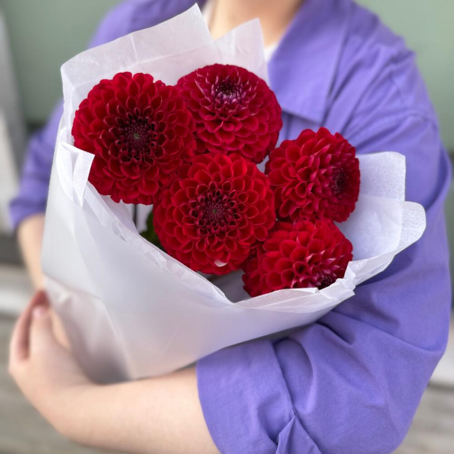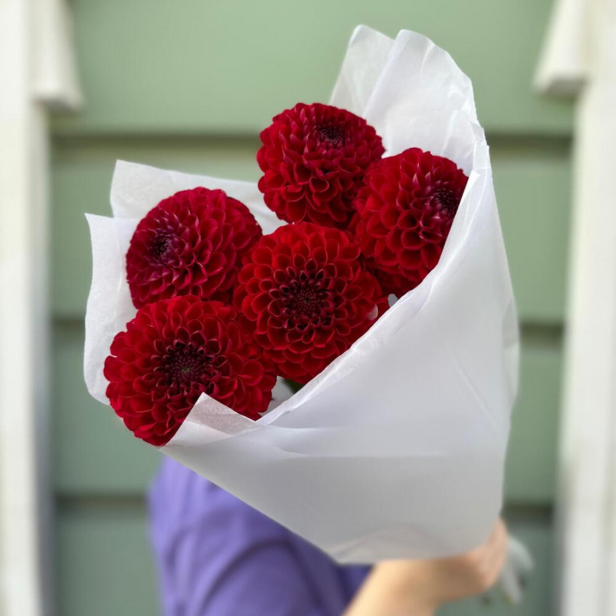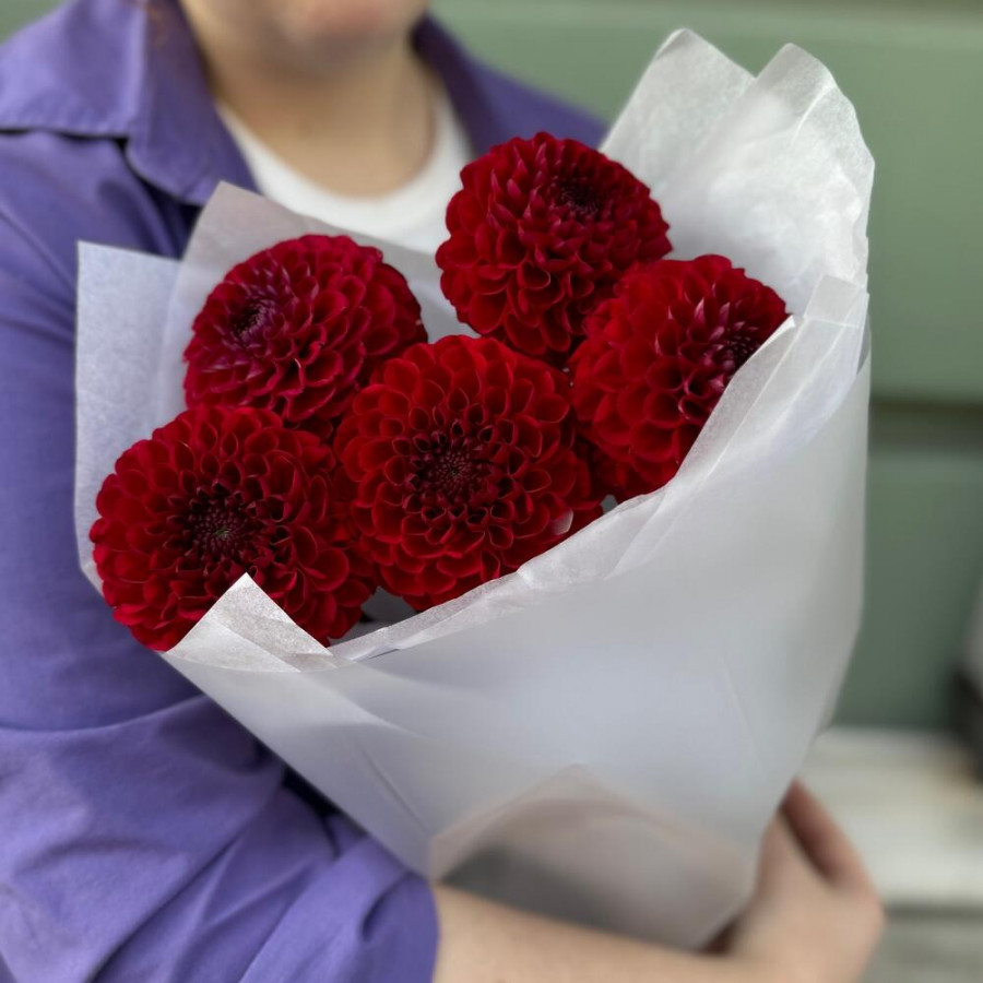 На фото букет из 5 красных георгин. В составе: георгина 5 шт, дизайнерская упаковка 2 шт, атласная лента 1 шт, . Все цветы свежие и ароматные, букет красиво оформлен и отлично подходит для подарка. Доступна доставка цветов или самовывоз.