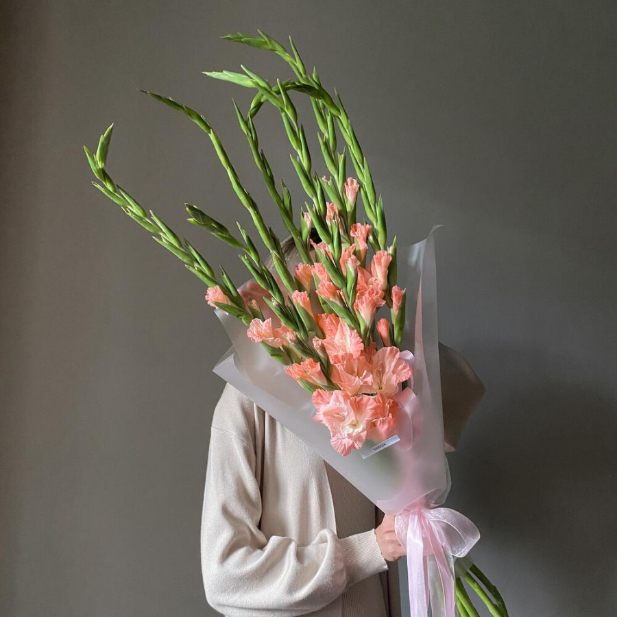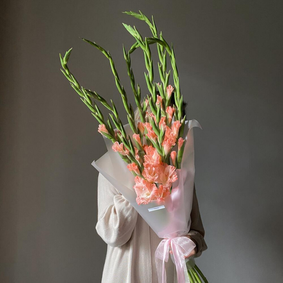 На фото букет из 7 коралловых гладиолусов. В составе: гладиолус 7 шт, дизайнерская упаковка 1 шт, . Все цветы свежие и ароматные, букет красиво оформлен и отлично подходит для подарка. Доступна доставка цветов или самовывоз.