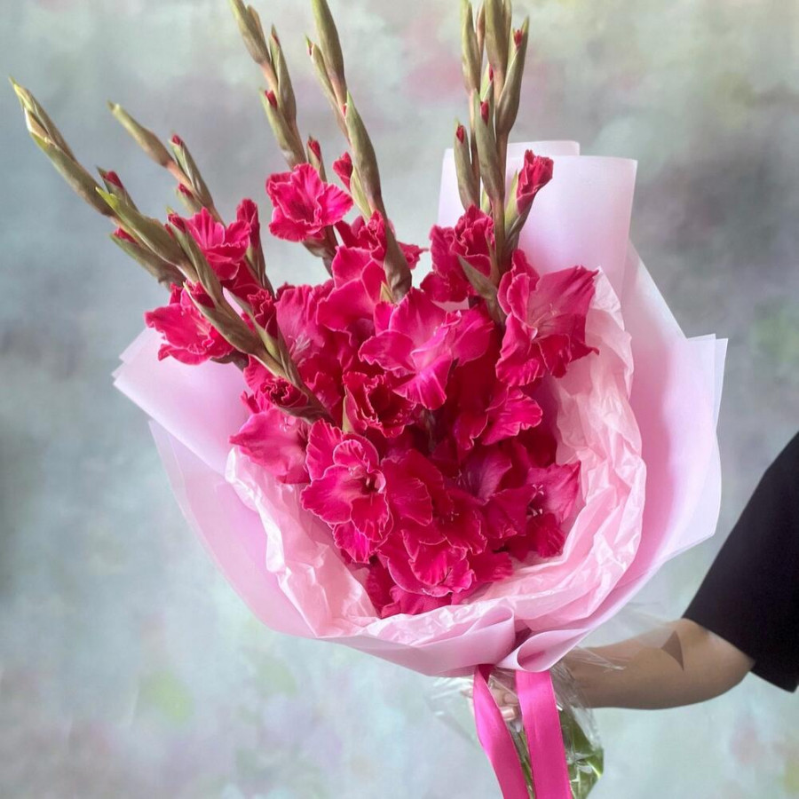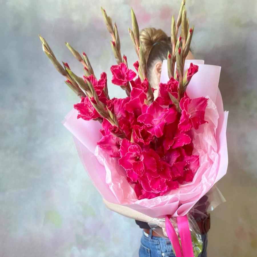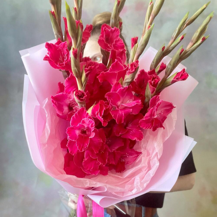 На фото букет из 7 малиновых гладиолусов. В составе: гладиолус 7 шт, дизайнерская упаковка 2 шт, атласная лента 1 шт, . Все цветы свежие и ароматные, букет красиво оформлен и отлично подходит для подарка. Доступна доставка цветов или самовывоз.
