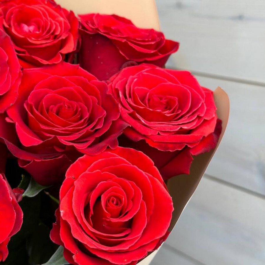 На фото букет из 9 красных роз. В составе: роза 9 шт, крафт-бумага 1 шт, атласная лента 1 шт, . Все цветы свежие и ароматные, букет красиво оформлен и отлично подходит для подарка. Доступна доставка цветов или самовывоз.
