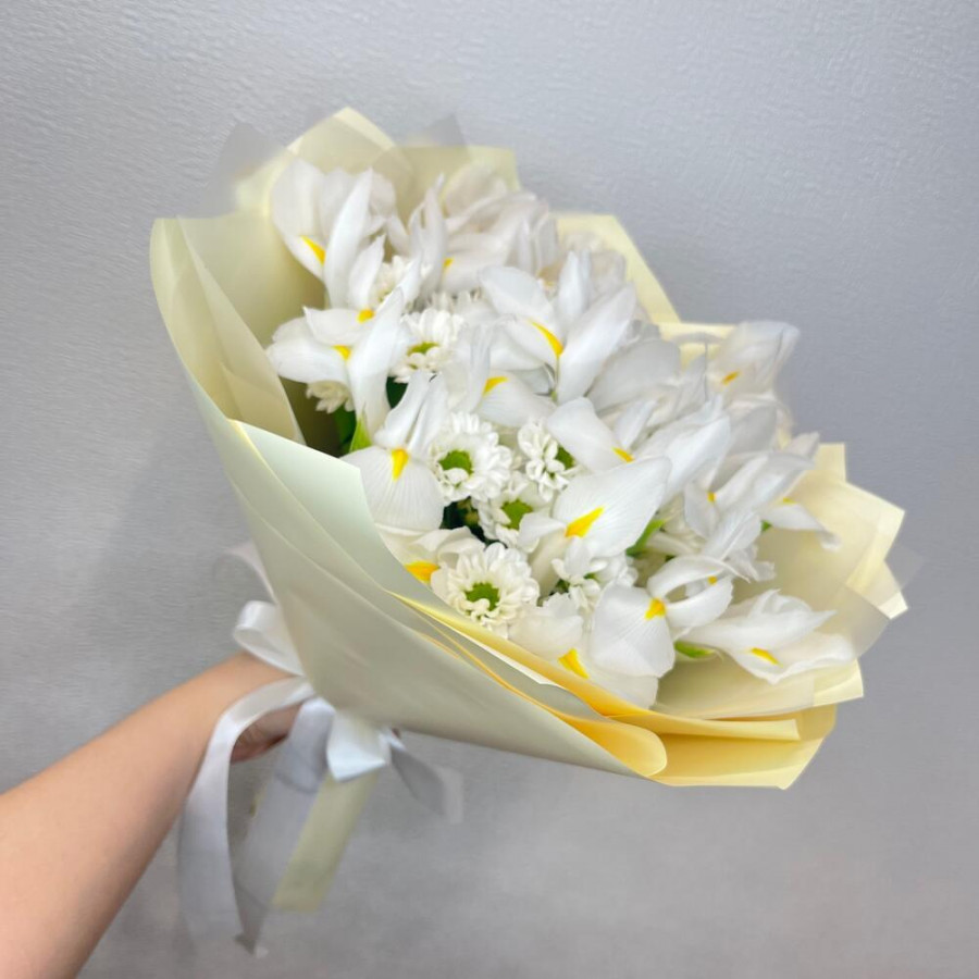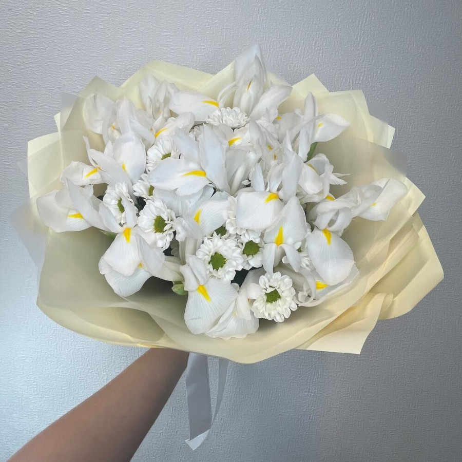 На фото букет из белых ирисов и белой хризантемы. В составе: ирис 11 шт, хризантема кустовая 4 шт, дизайнерская упаковка 1 шт, атласная лента 1 шт, . Все цветы свежие и ароматные, букет красиво оформлен и отлично подходит для подарка. Доступна доставка цветов или самовывоз.