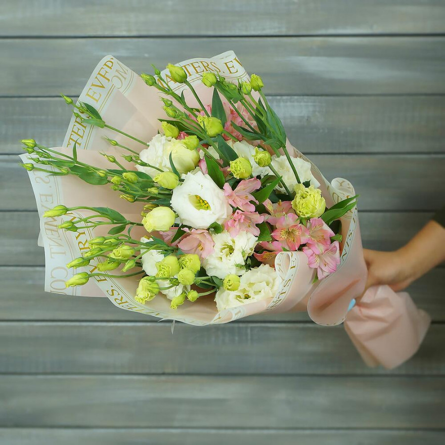 На фото букет из розовых альстромерий и белых эустом. В составе: альстромерия 3 шт, эустома (лизиантус) 5 шт, дизайнерская упаковка 1 шт, атласная лента 1 шт, . Все цветы свежие и ароматные, букет красиво оформлен и отлично подходит для подарка. Доступна доставка цветов или самовывоз.