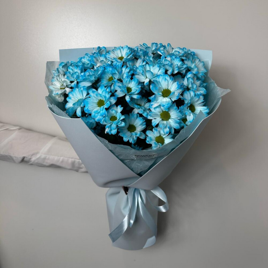На фото букет голубых ромашек. В составе: хризантема кустовая 5 шт, крафт-бумага 1 шт, атласная лента 1 шт, . Все цветы свежие и ароматные, букет красиво оформлен и отлично подходит для подарка. Доступна доставка цветов или самовывоз.