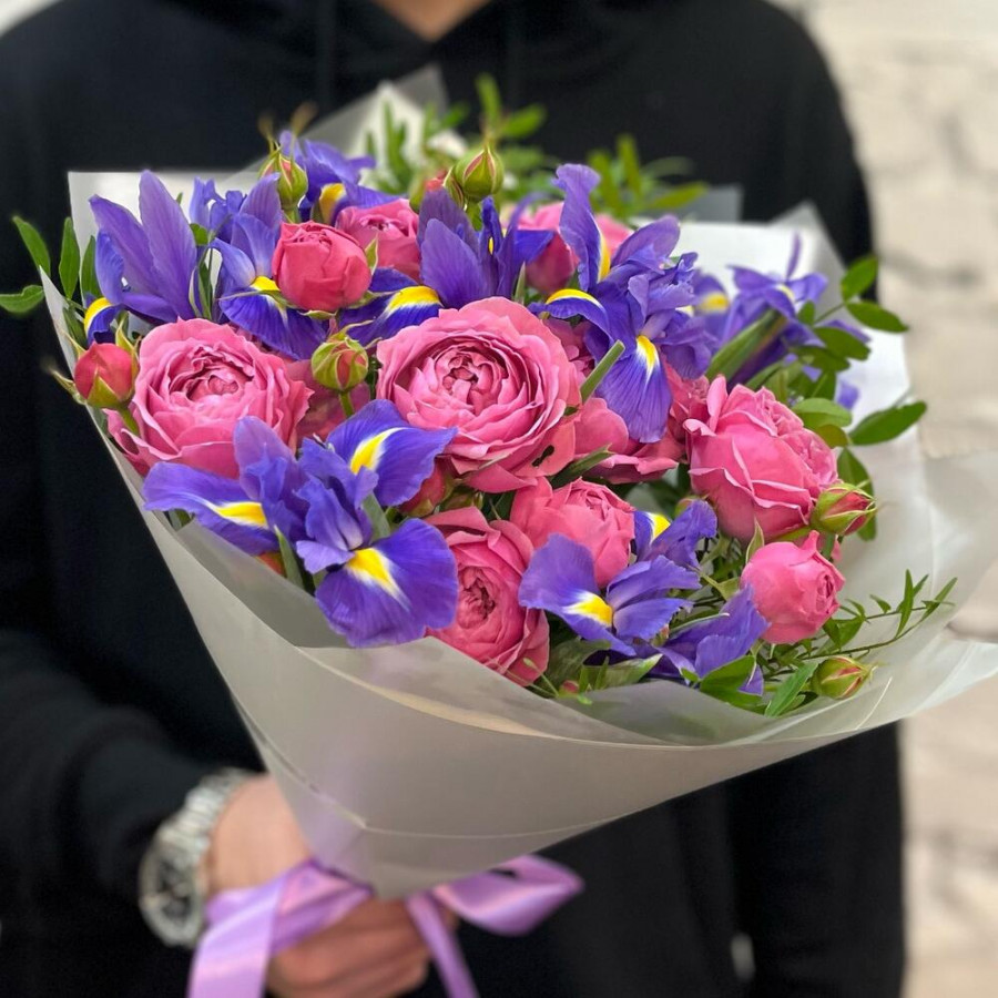 Букет из розовых пионовидных роз и синих ирисов в Тамбове