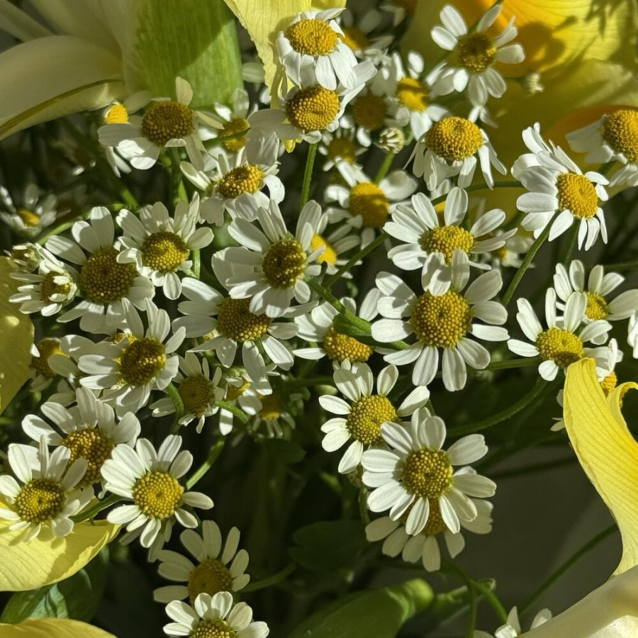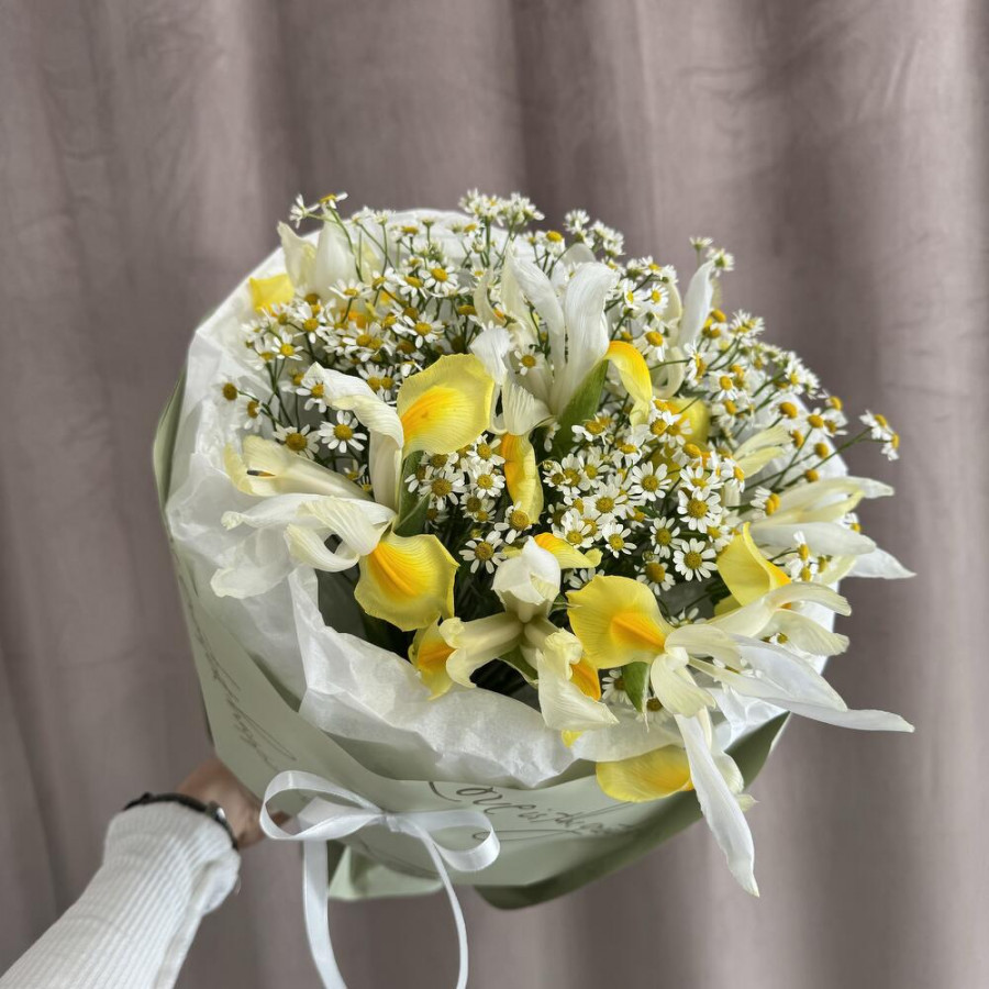 Букет из желтых ирисов и ромашек