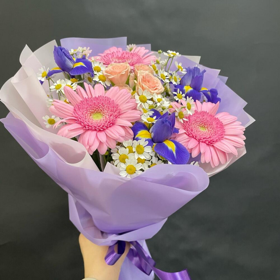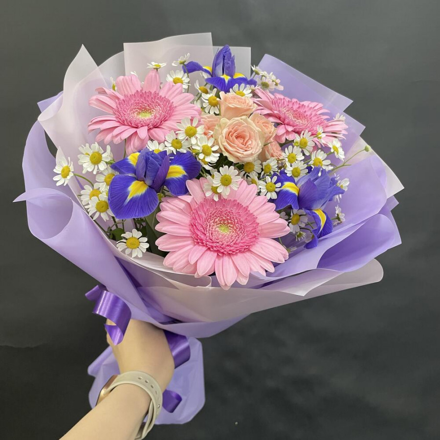 На фото букет из розовых гербер, ирисов и ромашек. В составе: ирис 3 шт, кустовая роза 1 шт, танацетум 3 шт, дизайнерская упаковка 1 шт, атласная лента 1 шт, . Все цветы свежие и ароматные, букет красиво оформлен и отлично подходит для подарка. Доступна доставка цветов или самовывоз.
