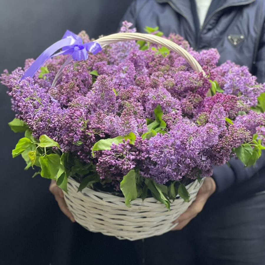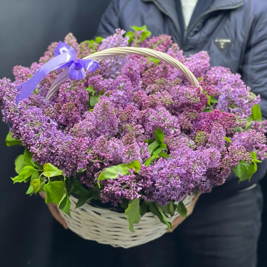 На фото композиция с сиренью в корзине. В составе: сирень 41 шт, оазис флористический 4 шт, корзина (xl) 1 шт, . Все цветы свежие и ароматные, букет красиво оформлен и отлично подходит для подарка. Доступна доставка цветов или самовывоз.